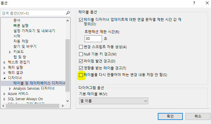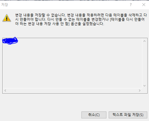 다시 만들 수 없는 테이블을 변경했거나 [테이블을 다시 만들어야 하는 변경 내용 저장 사용 안 함] 옵션을 설정했습니다.