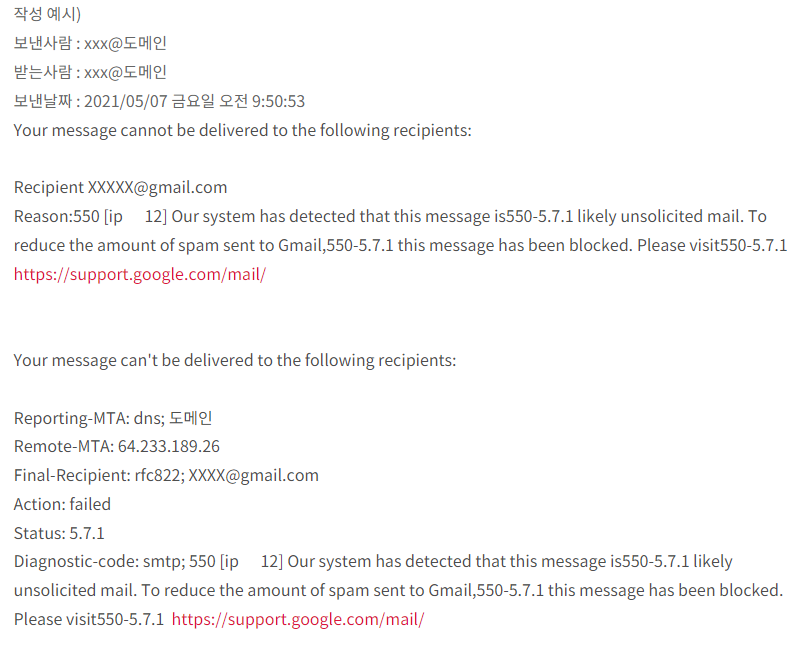 일딴 해당 메일계정을 보안조치하여 해결했습니다. 그 후 Gmail쪽으로 메일 발송시 아래와 같이 리턴메일이 돌아오는 상태가 되었습니다.