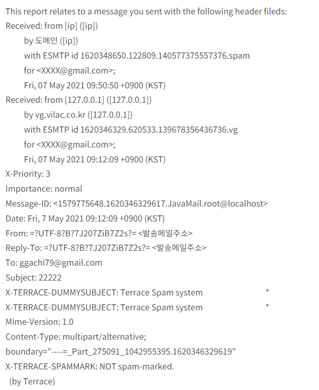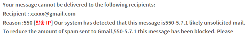 해결방법 : ㅠ.ㅠ 특별한것 없습니다. 구글(Gmail)측에 아래와 같이 스펨등록된 ip를 해제 요청 해야됩니다.
