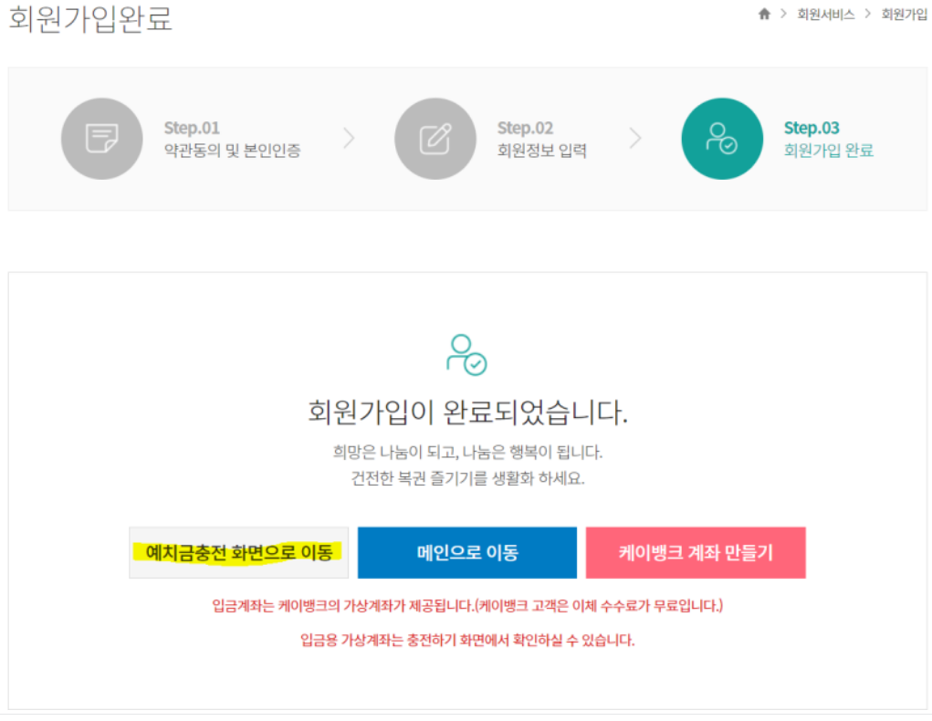 3. 회원 가입이 완료 되면 예치금 충전 링크를 알려줍니다. K뱅크 고객은 수수료가 무료라고 합니다.