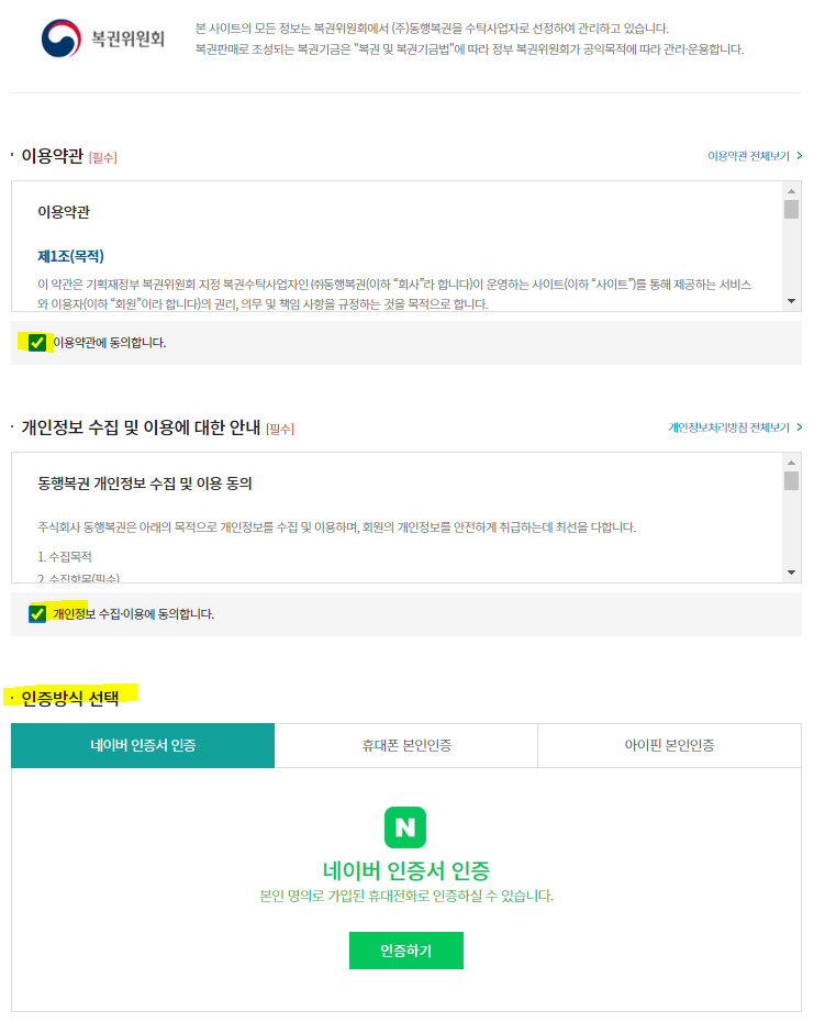 2. 약간 동의 후 인증방식을 선택하여 본인 인증합니다. (복권은 사행성이라 성인만 가입가능합니다.)