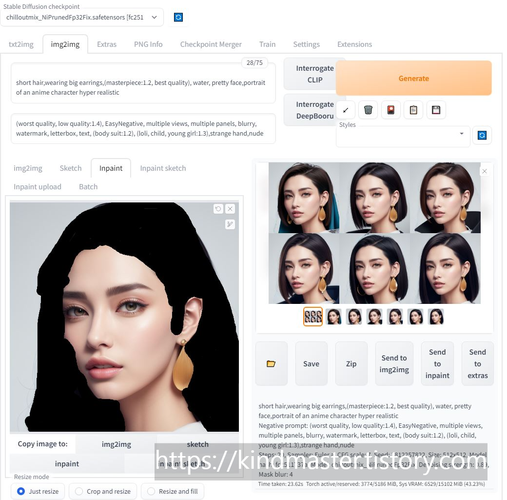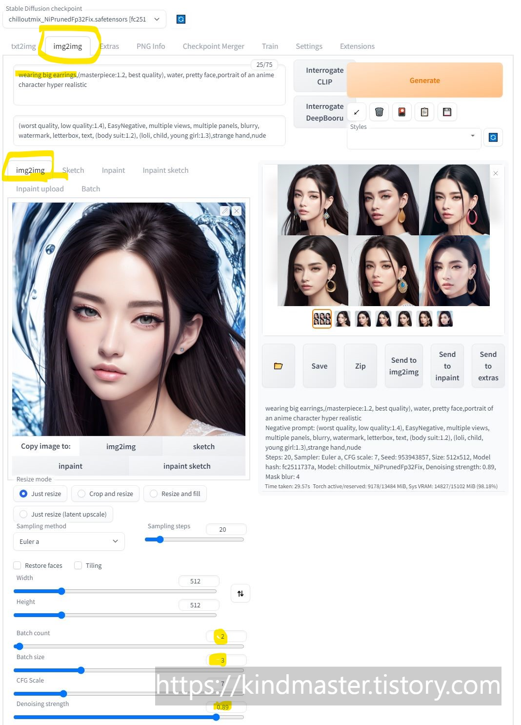 3. prompt 창에 wearing big earrings 를 추가 후 6개의 이미지를 한번에 생성하기 위해서 batch count (2) , batch size(3)를 조정 합니다.