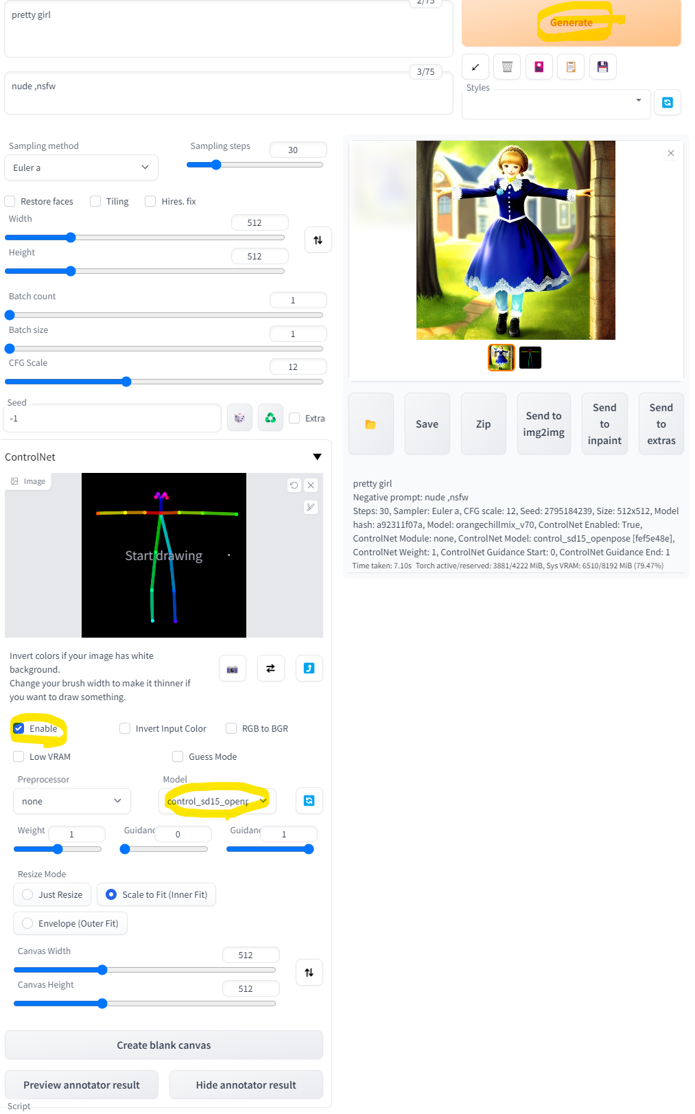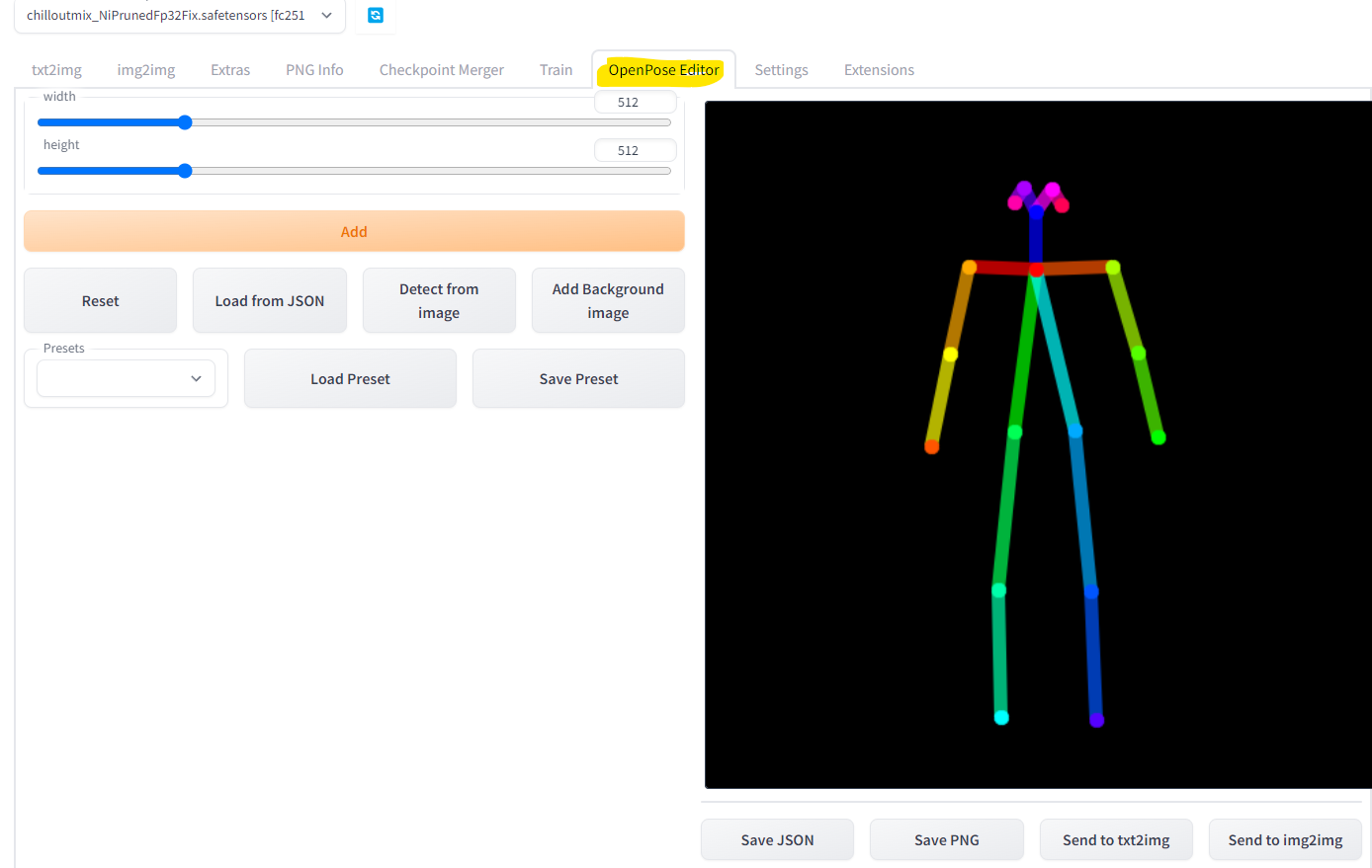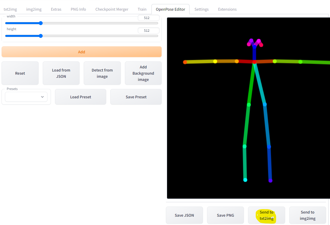 오른쪽 졸라맨 같은 이미지의 둥근 점부분을 클릭하여 원하는 포즈로 변경 후 Send to txt2img 버턴을 클릭합니다.