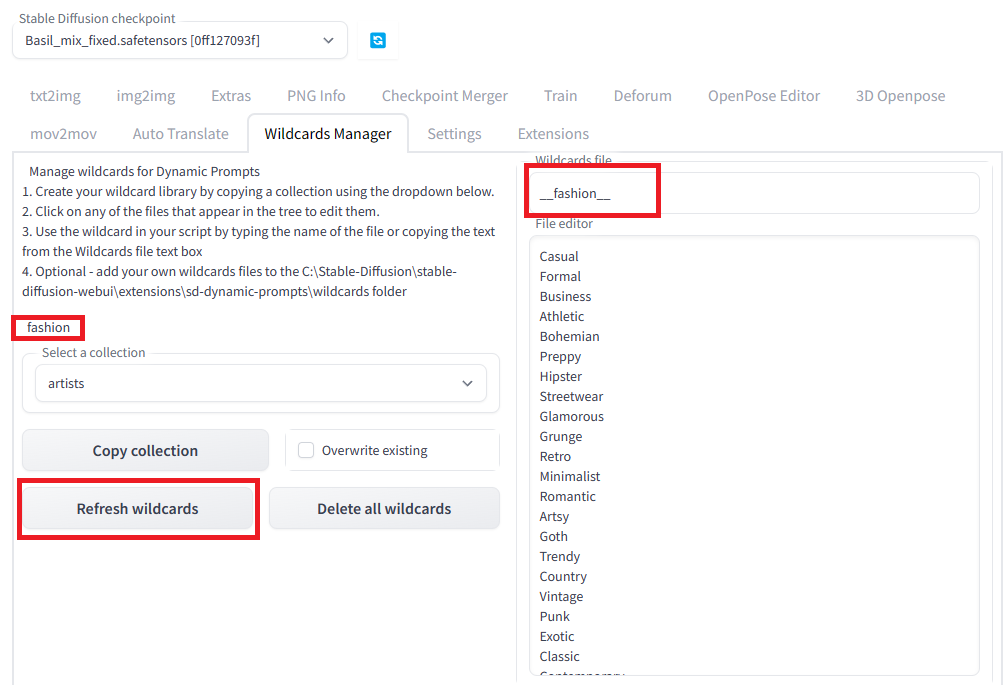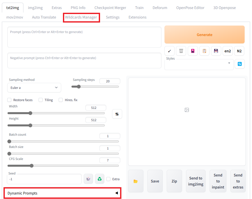 6. Stable Diffusion 재시작후 아래와 같이 Wildcards Manager 탭과 Dynamic Prompts 가 생성되어 있다면 설치는 완료된 것입니다.