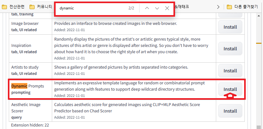 2. Ctrl + F 눌러 dynamic 를 검색하여 Dynamic Prompts prompting 에 있는 Install 버턴 클릭