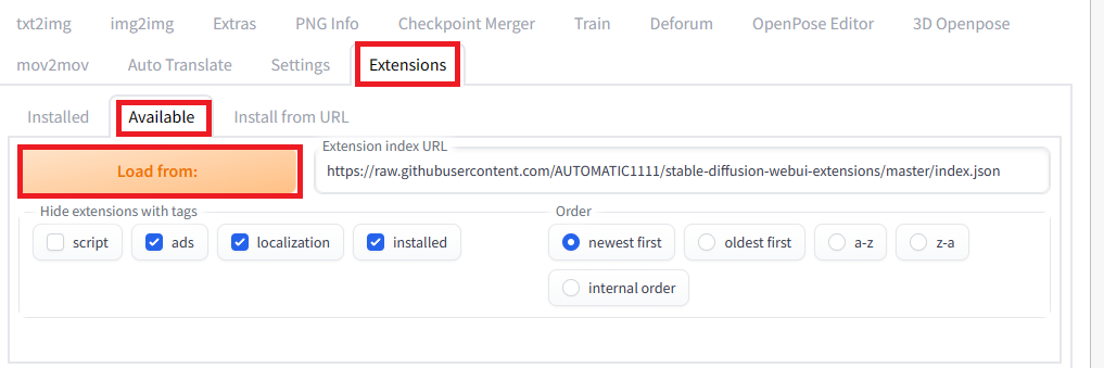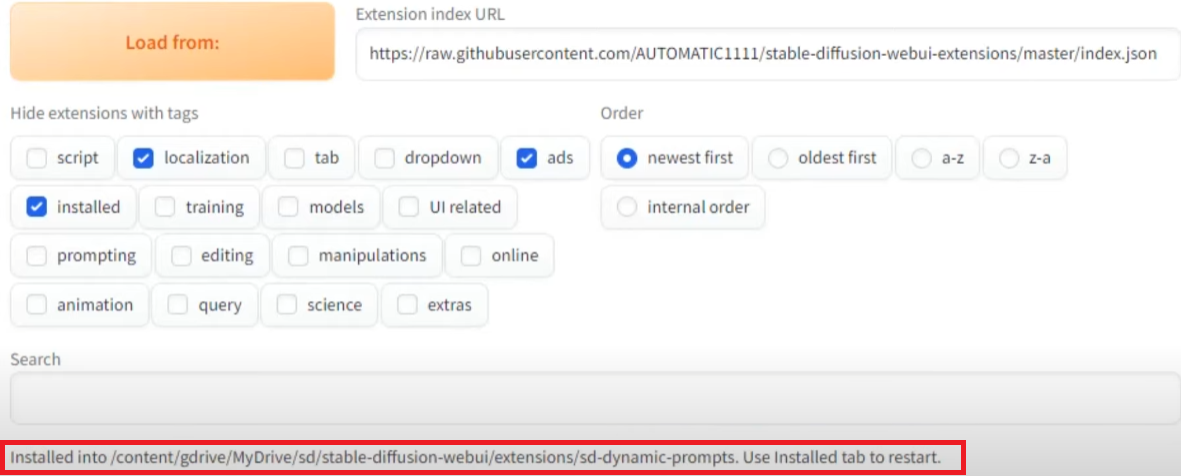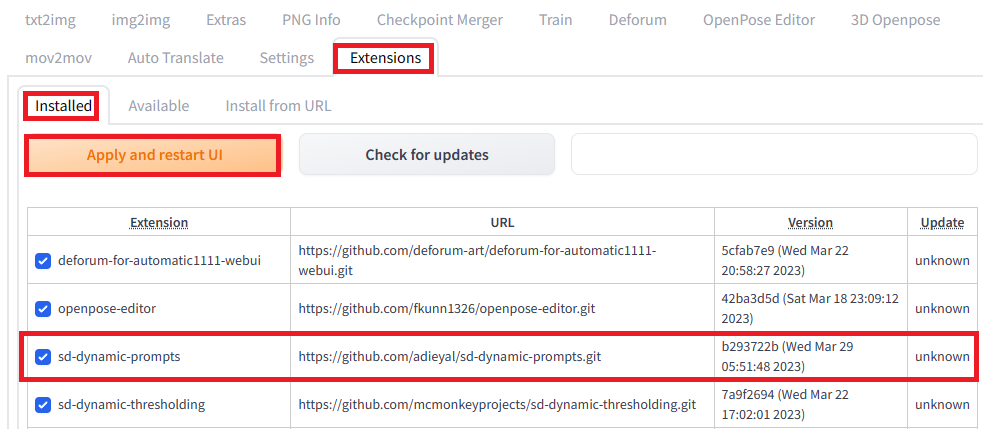 4. 설치가 완료되면 Extensions > Installed 메뉴에 sd-dynamic-prompts 설치된 것을 확인 할 수 있습니다.