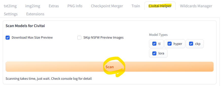 3. Civitai Helper 탭에서 Scan 버턴 클릭