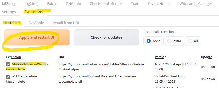 2. Extensions > Installed 탭에서 Stable-Diffusion-Webui-Civitai-Helper 확인 후 Apply and Restart UI 클릭