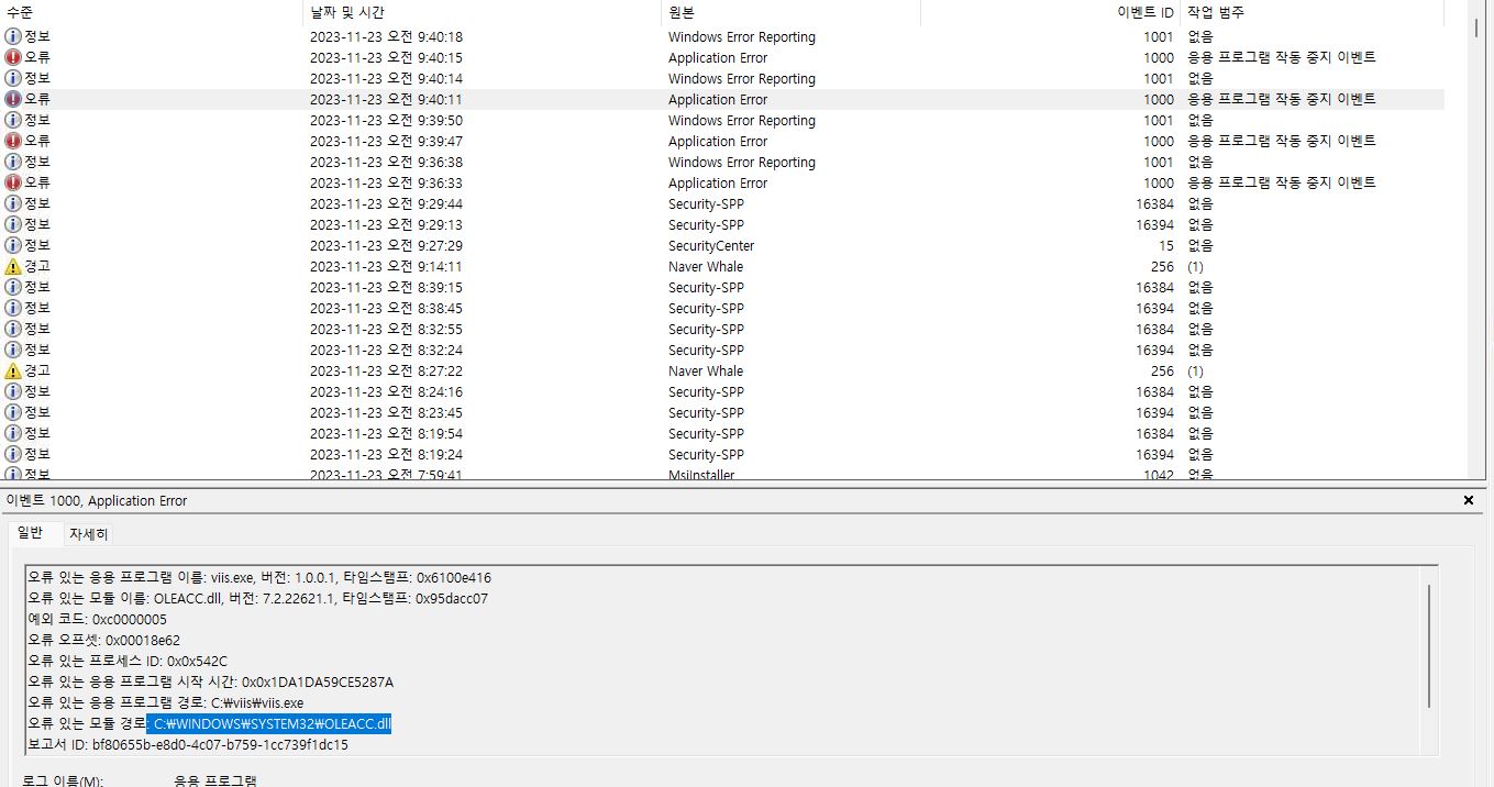 Accessibility Insights for Windows 프로그램과 충돌 발생, 이 프로그램은 윈도우 프로그램에서 발생한 이벤트를 감지하는 프로그램 입니다. 주로 문서중앙화나 이벤트 감지가 필요한 경우 백그라운드에서 사용합니다.