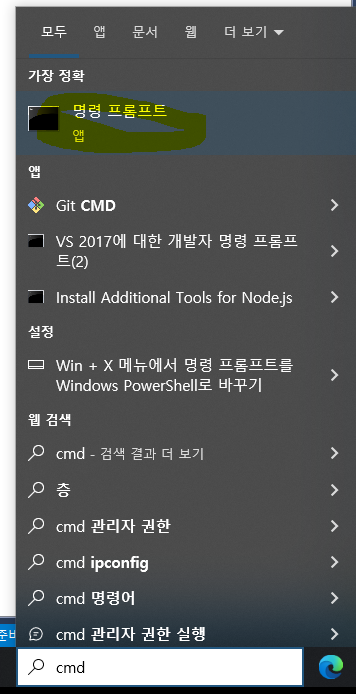 윈도우 시작버튼 옆에 있는 왼쪽 하단 검색창에 CMD를 입력하거나, 윈도우키+R을 눌러 실행창에서 cmd 를 입력한 다음 “명령 프롬프트”를 실행합니다.