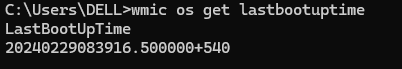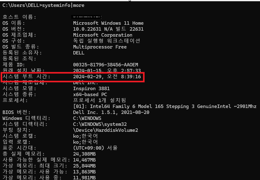 systeminfo 명령어가 출력되는데 시간이 너무 오래걸리거나 동작하지 않을 때 간단하게 부팅시간만 확인할 수 있는 명령어 입니다.