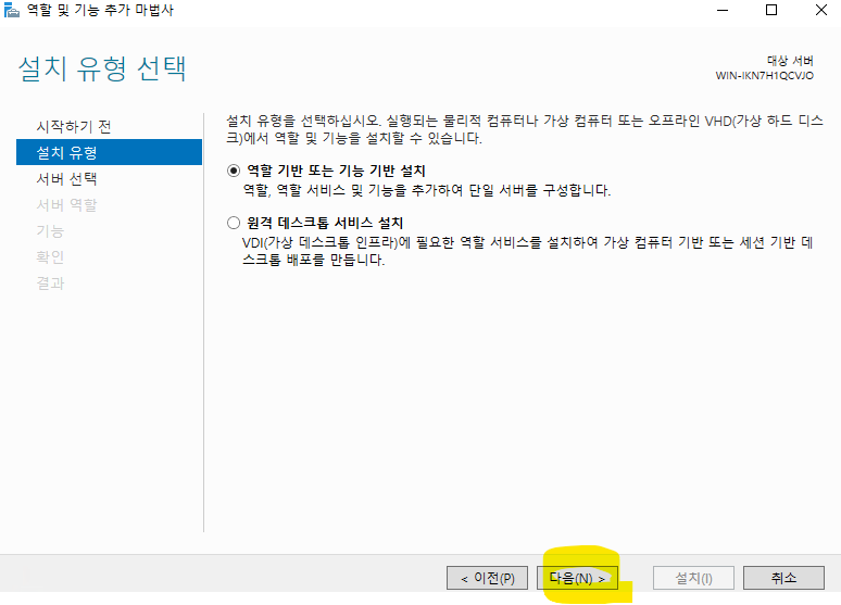 3. 역할 기반 또는 기능 기반 설치 선택 후 다음 클릭