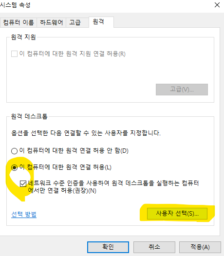 2. 팝업 메뉴에서 아래 그림과 같이 "이 컴퓨터에 대한 원격 연결 허용(L)" 선택