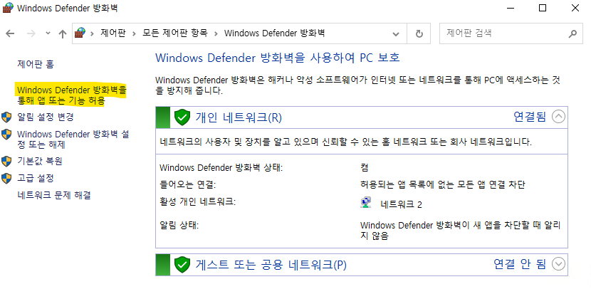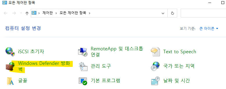 제어판 > 모든 제어판 항목 > Windows Defender 방화벽 클릭