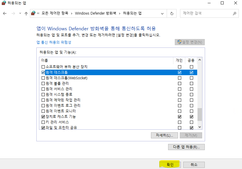 7. 아래 이미지와 같이 "원격 데스크톱" 항목에 체크 후 확인 클릭