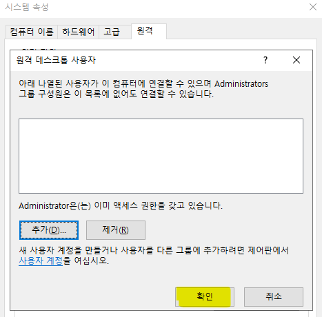 일반 사용자 추가가 필요한 경우 추가를 클릭해서 사용자 추가 후 확인 클릭
