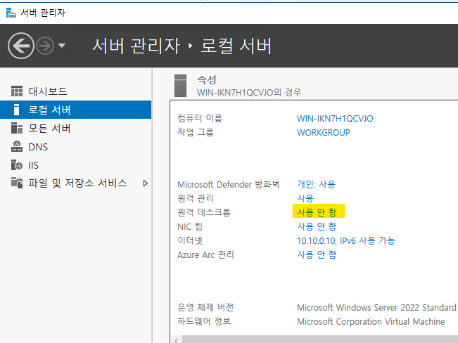 1.서버관리자 > 로컬 서버 > 원격 테스크톱 사용 안함 클릭