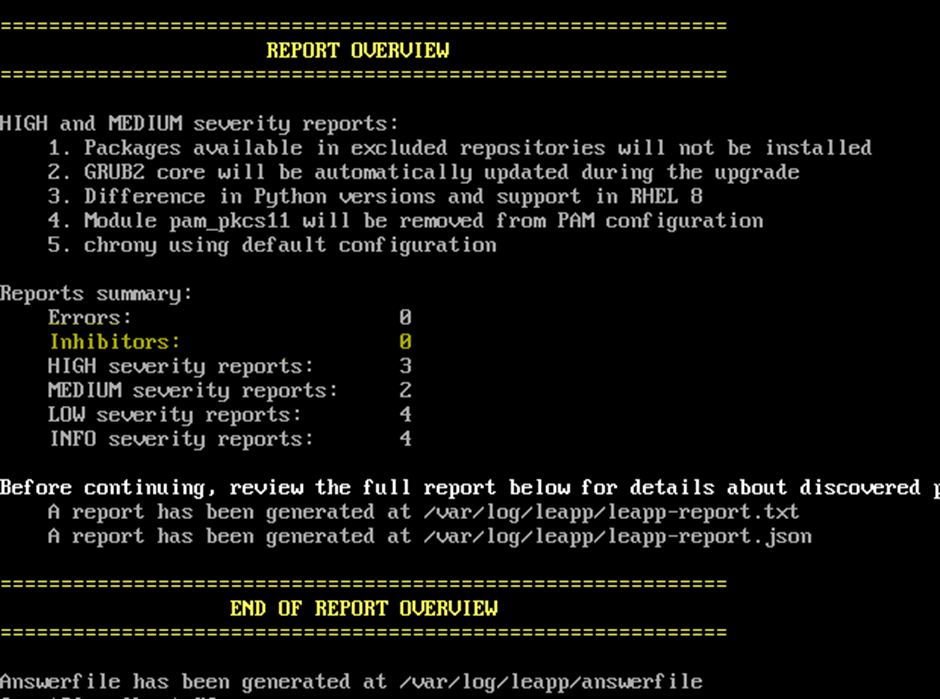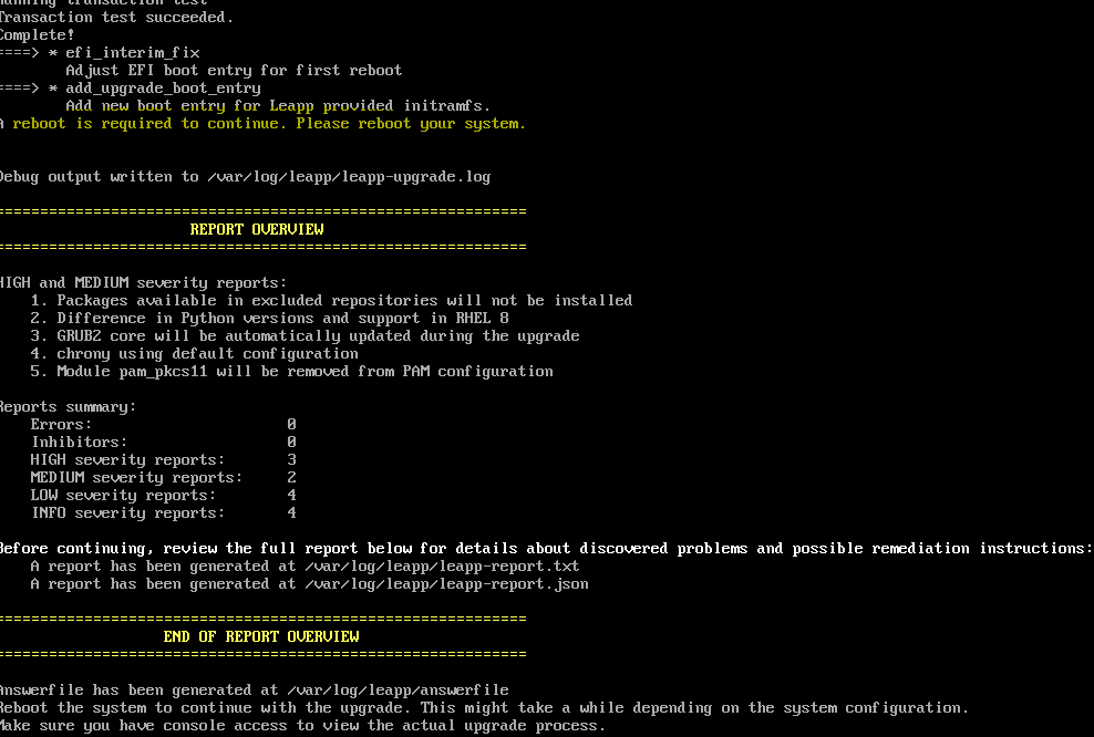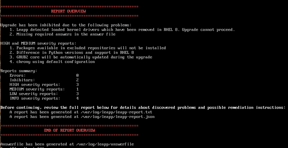 10) 처음라면 leapp preupgrade –target 버전 명령어로 OS 업그레이드 전 사전 문제점 파악 후 설치 (권장)