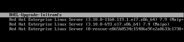 라. 리부팅 하면 아래와 같이 RHEL Upgrade Initramfs 란 업그레이드 진행 메뉴가 보입니다. 해당 메뉴를 선택하여 업그레이드를 진행합니다. (진행 시간 40분 정도 걸린것 같습니다.)